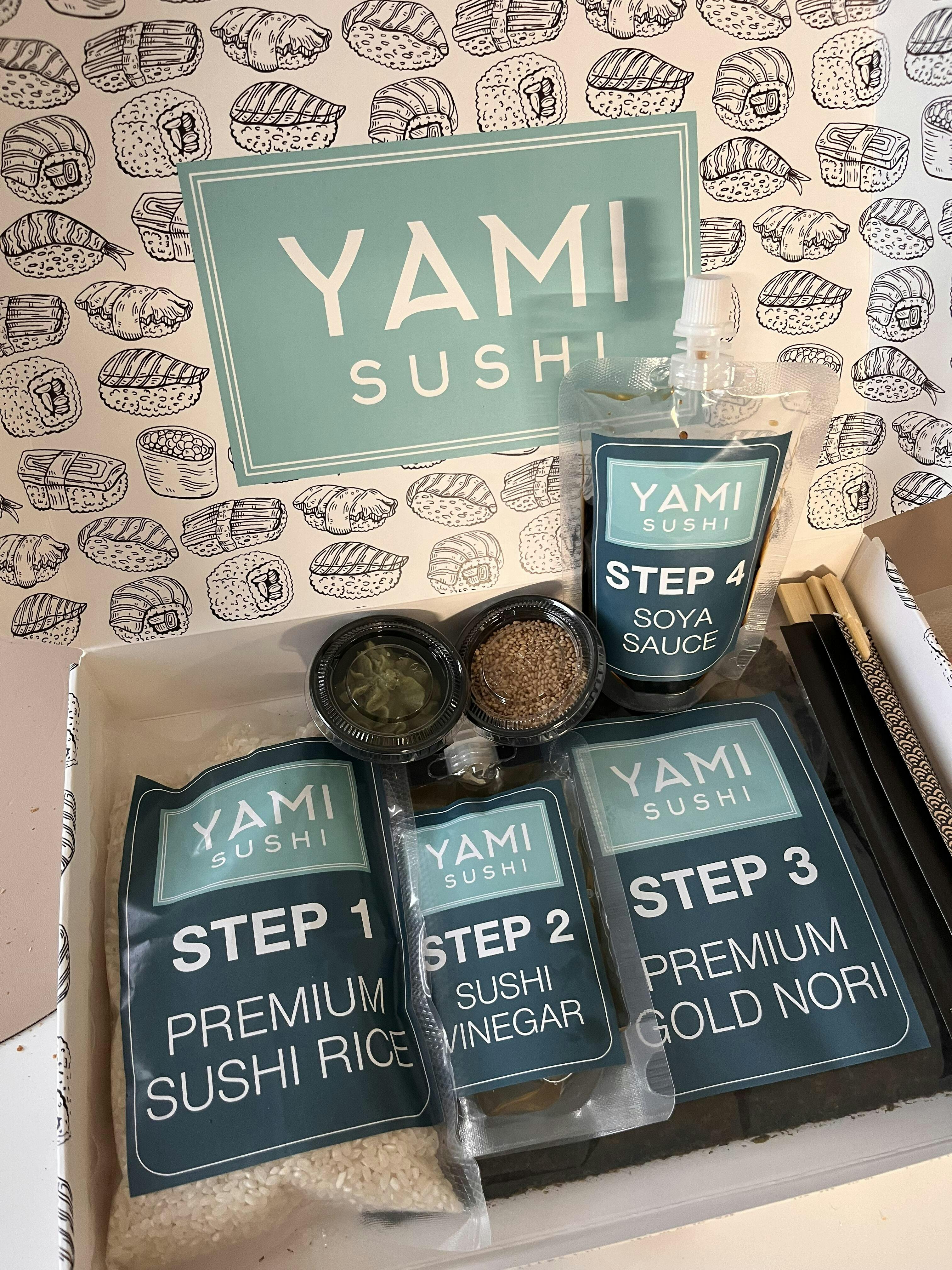 Aloituspakkaus sisältää kaiken tarvittavan sushin valmistamiseen: tahmeaa sushiriisiä, nori-levyjä, pikkelöityä inkivääriä, wasabijauhetta, premium-soijakastiketta, tislattua etikkaa, sushimaton sekä yksityiskohtaisen reseptioppaan.